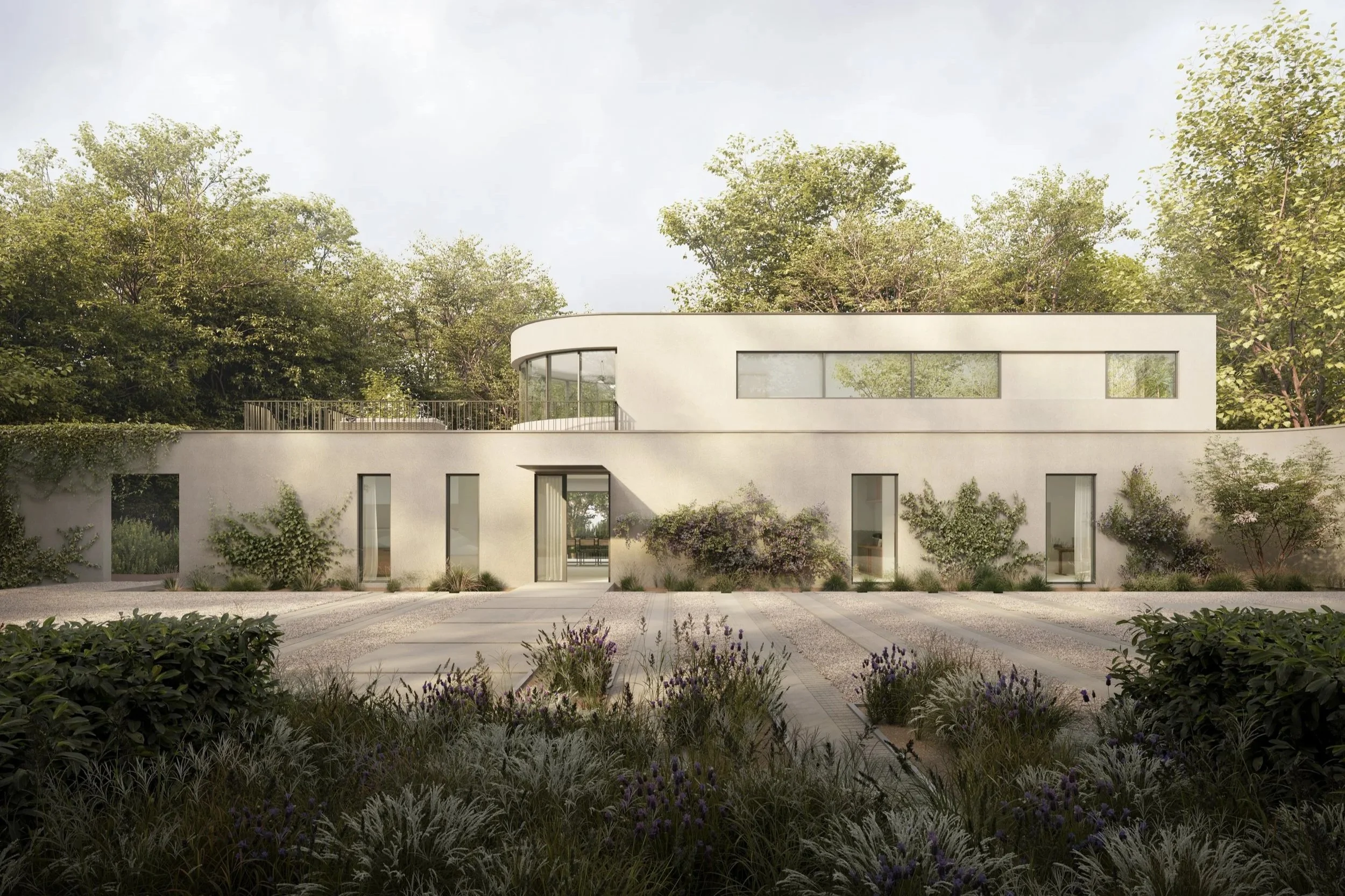 A Bauhaus-inspired lakeside home in the Netley Abbey Conservation Area. Early collaboration with planners secured approval first-time. Now under construction, the 400m² design integrates contemporary architecture with its historic and natural setting.